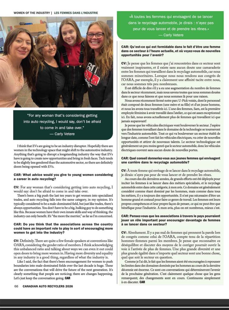 Carly Vetere was featured in this months Canadian Auto Recyclers Magazine for Women in the Industry 2026.